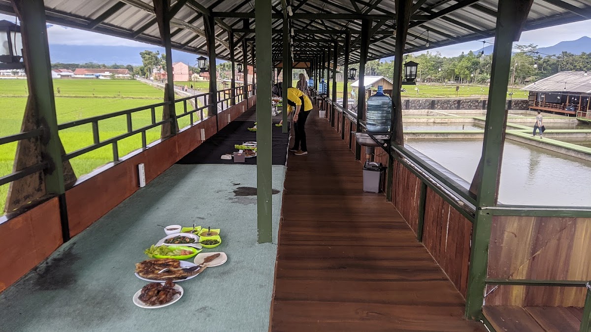 Tempat parkir lumayan luas, area makan juga bisa buat rombongan. Viewnya indah banget, sawah dan gunung. Harga menu makanannya relatif murah. Ikan bakarnya recomended, enak, pake bumbu kecap atau cobek. Hanya saja kalau siang hari tempatnya jadi terasa sangat panas karena di antara kolam dan sawah, cocoknya datang sore atau malam. Dan kalau sedang ramai pengunjung, datang menu pesanan jadi sangat lama. Minuman dalam menu kurang recomended.